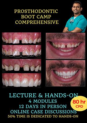 The Prosthodontic Boot Camp - Comprehensive Course is a year-long residency designed to elevate your skills and enhance your clinical practice. This program combines in-person training with online modules, providing a complete framework to tackle cases. Curated from my personal workflow in a specialist prosthodontic clinic, this course is designed to help you view cases through a new lens. With intentional spacing between modules, you’ll have the opportunity to apply your learning in practice and revisit questions or challenges in subsequent sessions.